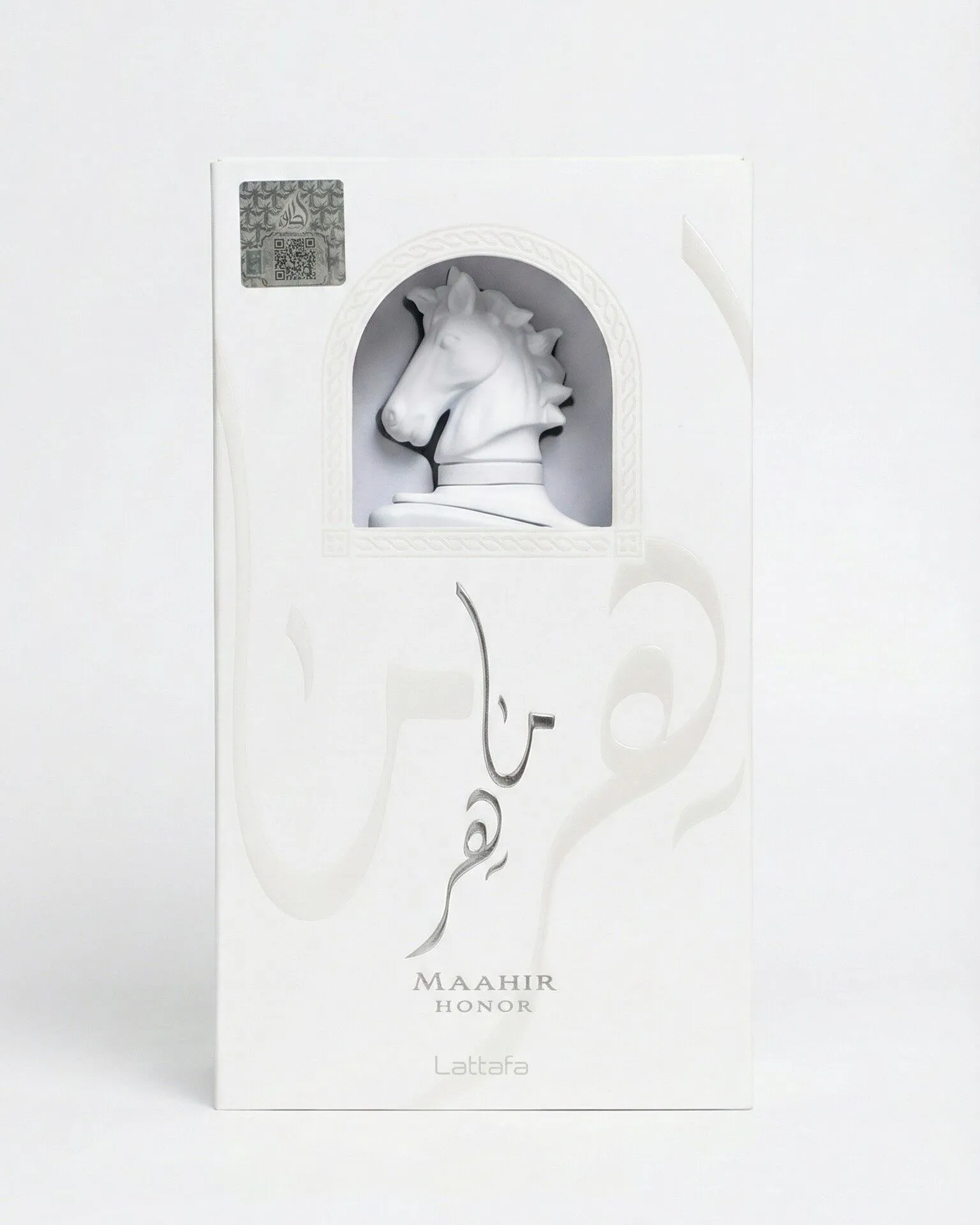Maahir Honor — унисекс-парфюм в формате Eau de Parfum, выпущенный во впечатляющем белом флаконе с изображением белого жеребца, символизирующего природную силу и лёгкую элегантность.